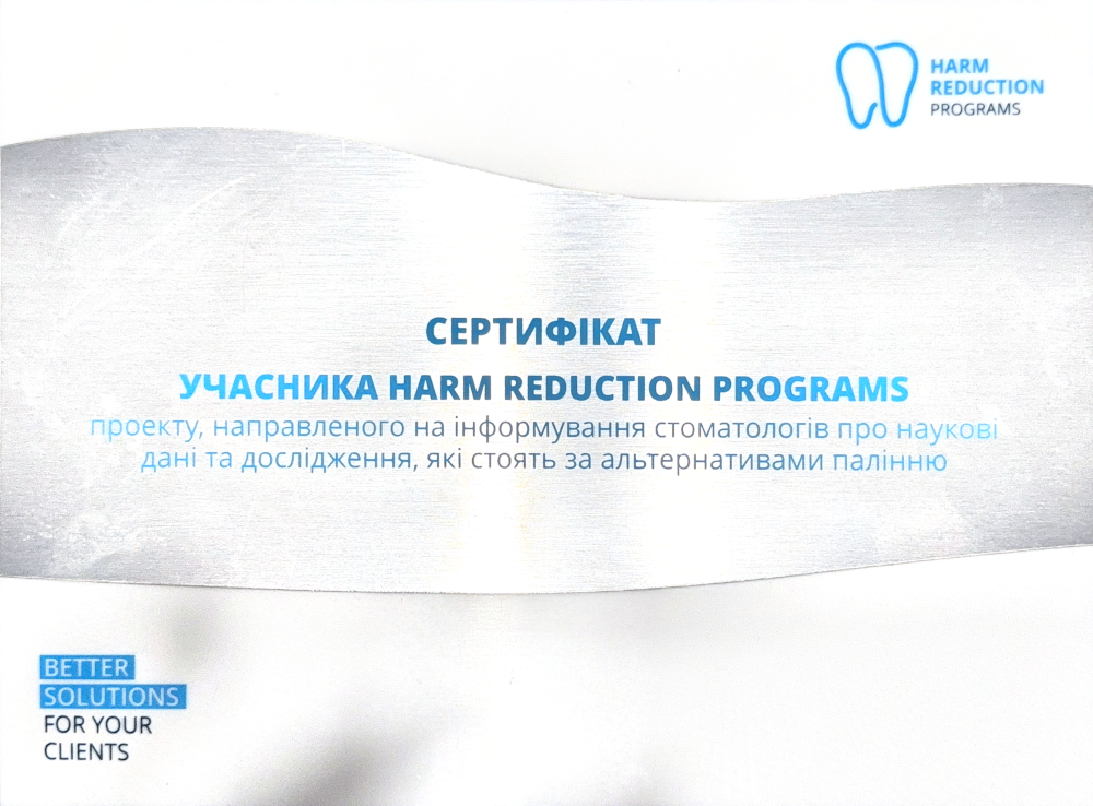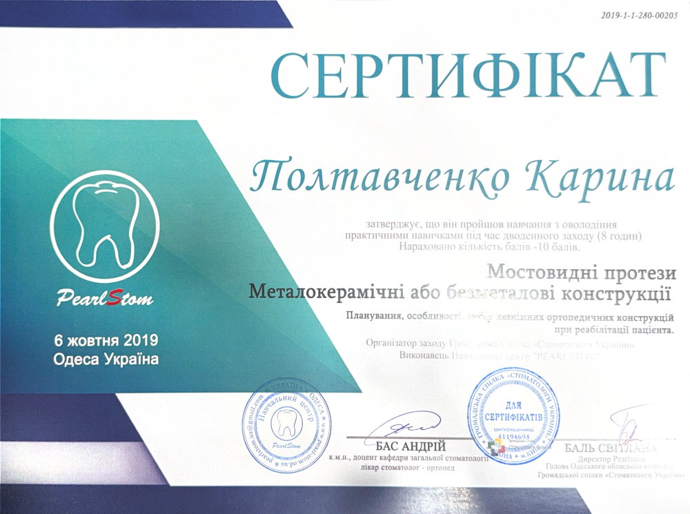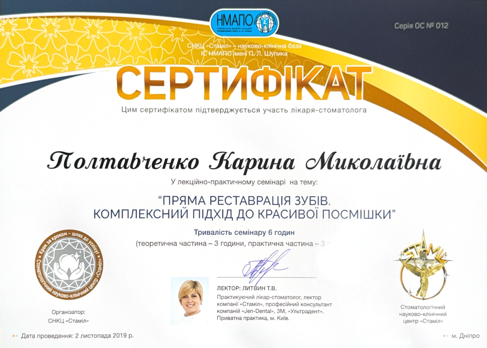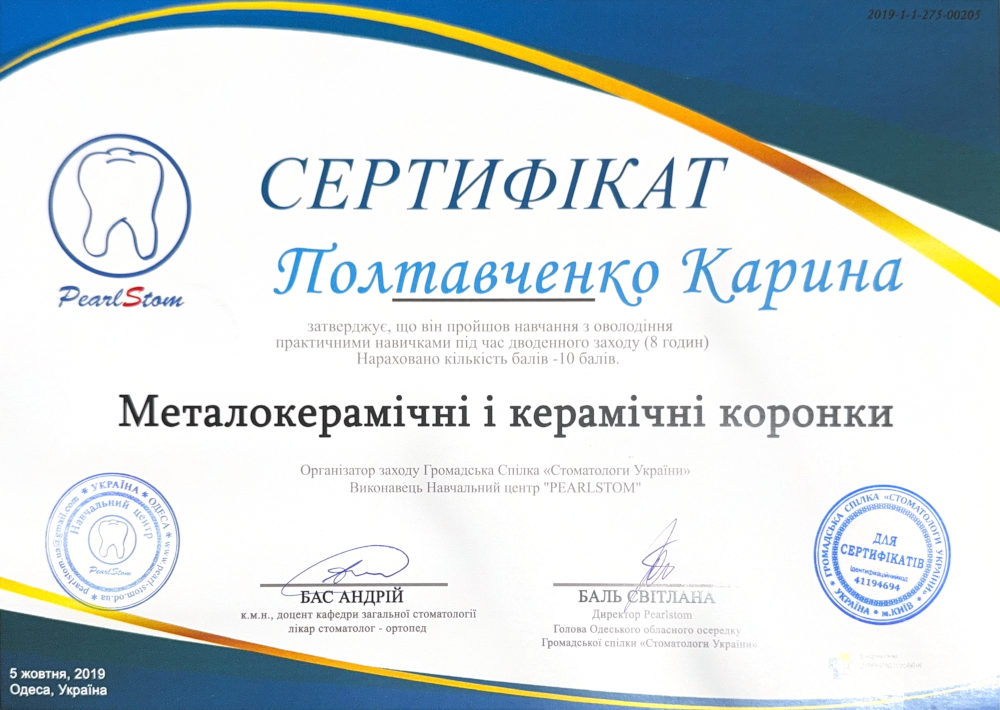 • 2014 — Отримала сертифікат спеціаліста зі спеціальності “Стоматологія загальної практики”